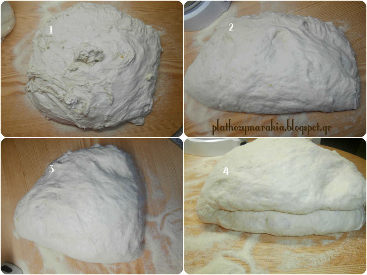 - Μεταφέρουμε τη ζύμη σε αλευρωμένηκαι καθαρή επιφάνεια. Χωρίζουμε τη ζύμη σε 3- 4 μέρη.